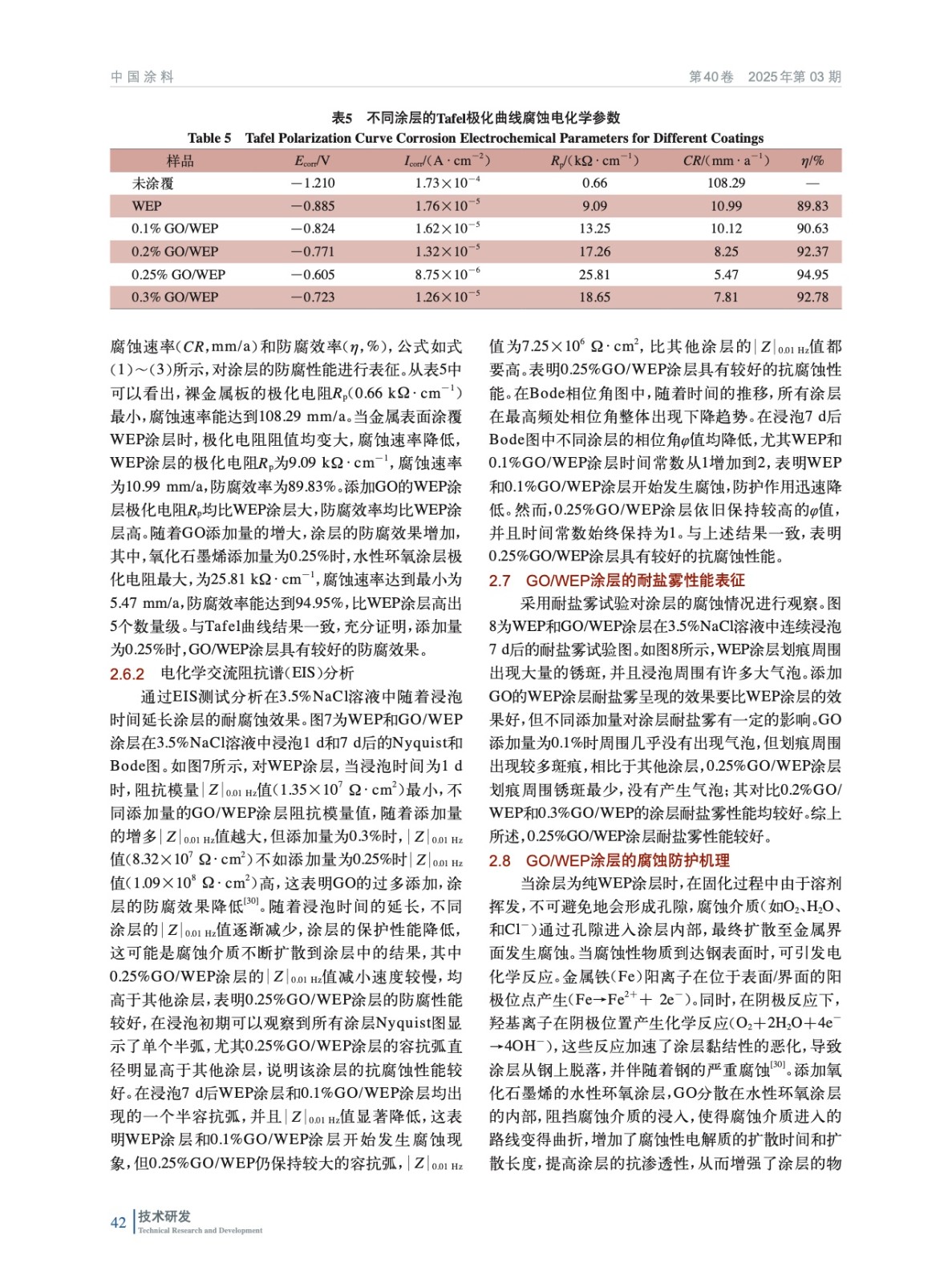 摘要:采用改進的Hummer’s方法制備氧化石墨烯(Graphene Oxide,GO)納米材料,通過X-PS和SEM測試結果表明:二維片層結構GO表面含有較多的含氧官能團。然后制備氧化石墨烯水性環氧涂料(GO-WEP),探究不同含量氧化石墨烯對水性環氧樹脂涂層性能影響。與空白WEP涂層進行性能對比,添加量為0.25%(質量分數,后同)GO水性環氧涂層表面形貌平整,GO在涂層表面分散均勻,提高WEP涂層致密性;附著力可達到3.98 MPa,抗沖擊性為55 kg·cm,改善了WEP涂層的機械性能;通過電化學極化曲線和EIS阻抗測試表明:0.25%GO-WEP涂層與空白WEP涂層相比,防腐效率從89.83%提高至94.95%,|Z|0.01 Hz值可達到1.09×108 Ω·cm2;0.25%GO-WEP涂層表現出良好的防腐性能。