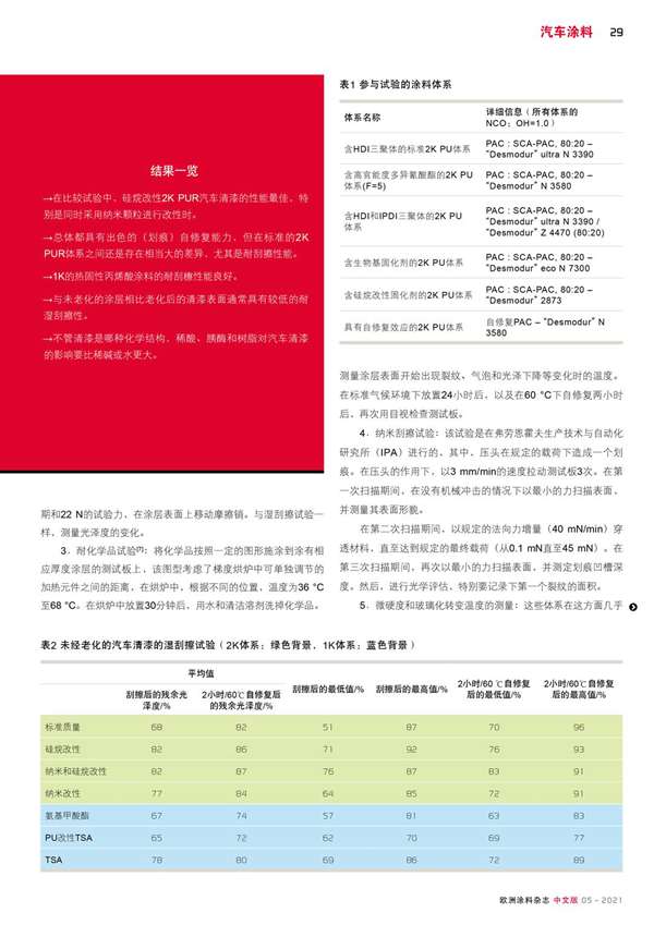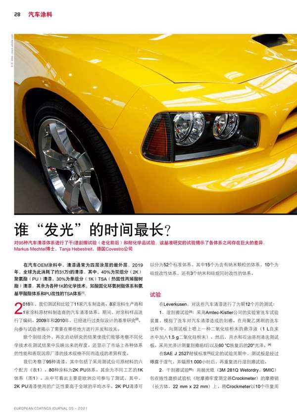對95種汽車清漆體系進行了干/濕刮擦試驗(老化前后)和耐化學品試驗。該基準研究的試驗揭示了各體系之間存在巨大的差異。