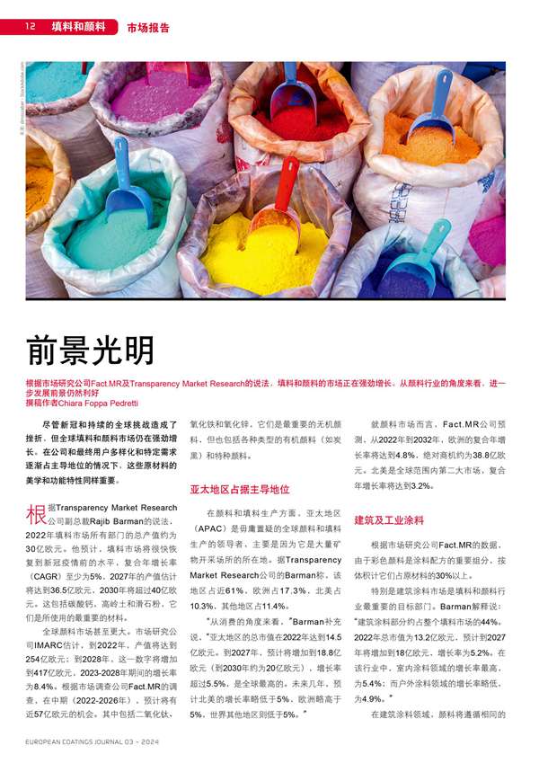 根據(jù)市場(chǎng)研究公司Fact.MR及Transparency Market Research的說法,填料和顏料的市場(chǎng)正在強(qiáng)勁增長(zhǎng)。從顏料行 業(yè)的角度來看,進(jìn)一步發(fā)展前景仍然利好