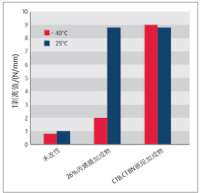 含有少量或未結合丙烯腈的RLP,玻璃化溫度較低,但不能和環氧樹脂混溶,貯存中會形成加成物,分離成兩相。美國專利7847026[7]詳述了一種新的加成物合成方法,這種加成物能與玻璃化溫度為-80 ℃的端羧基聚丁二烯(CTB)相容,用于改善低溫性能。