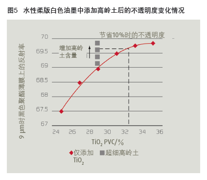 另一個感興趣的是保持配方中相同體積固含量(油墨干燥膜厚 相同),將TiO2 PVC含量維持在29%(低于非常稠密情況下的最佳 量),通過添加超細(xì)層狀高嶺土顆粒,來"間隔"TiO2顆粒。圖5表 明在PVC29% TiO2配方中高嶺土含量的增大可提高干油墨膜不透明 度。因此,僅含TiO2的配方不透明度性雖然也可以達(dá)到,但TiO2含量 要更高。圖中的虛線表示TiO2降低約10%。