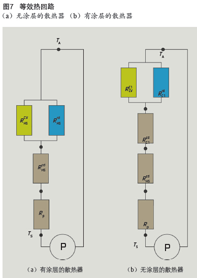 在散熱器表面增加一層涂層時,系統總熱阻的公式變成(見 圖7b):