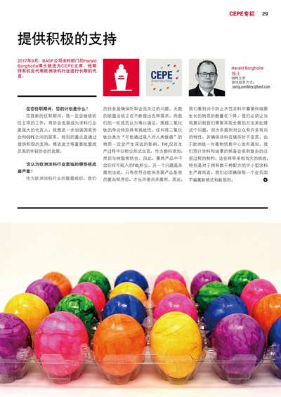2017年9月,BASF公司涂料部門的HaraldBorgholte博士被選為CEPE主席。
