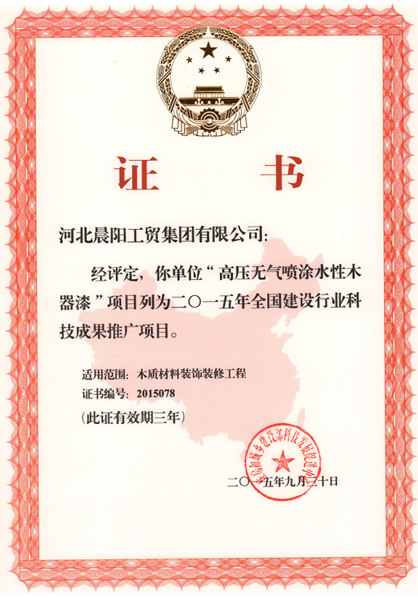 近日,由晨陽水漆研發(fā)生產(chǎn)的“高壓無氣噴涂水性木器漆”被列入2015年全國(guó)建設(shè)行業(yè)科技成果推廣項(xiàng)目。截至目前,該公司已有3項(xiàng)科技成果榮獲“全國(guó)建設(shè)行業(yè)科技成果推廣項(xiàng)目”證書。