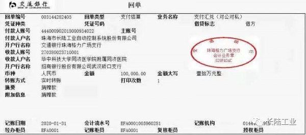 武漢疫情的發(fā)展也牽動著長陸人的心,今天,珠海市長陸工業(yè)自動控制系統(tǒng)股份有限公司(簡稱長陸工控)向武漢市華中科技大學同濟醫(yī)學院附屬同濟醫(yī)院捐贈人民幣10萬元,用于開展抗擊新型冠狀病毒感染的肺炎疫情之需,長陸公司希望以此為抗擊疫情盡一份綿薄之力。
