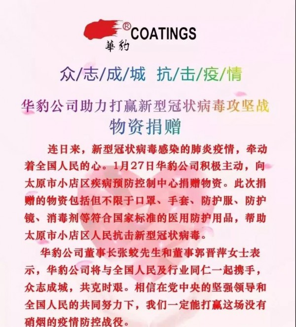 1月27日華豹公司積極主動(dòng),向太原市小店區(qū)疾病預(yù)防控制中心捐贈(zèng)物資。此次捐贈(zèng)的物資包括但不限于口罩、手套、防護(hù)服、防護(hù)鏡、消毒劑等符合國(guó)家標(biāo)準(zhǔn)的醫(yī)用防護(hù)用品,幫助太原市小店區(qū)人民抗擊新型冠狀病毒。