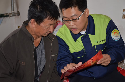 晨陽水漆工作人員為滿城小賽村路得申講解保險事宜