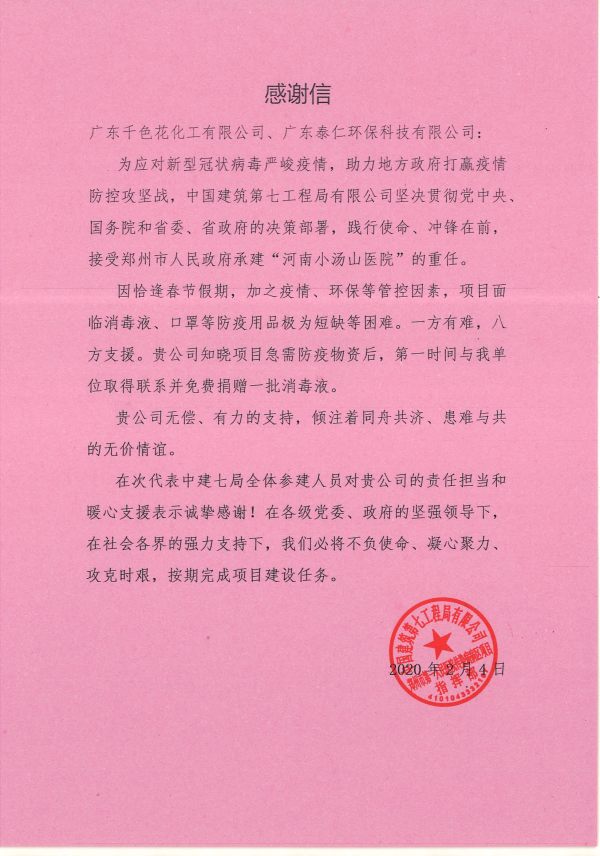 因恰逢春節(jié)假期,加之疫情、環(huán)保等管控因素,項目面臨消毒液、口罩等防疫用品極為短缺等困難。一方有難,八方支援。廣東千色花化工有限公司、廣東泰仁環(huán)保科技有限公司知曉項目急需防疫物資后,第一時間與承建單位取得聯(lián)系并免費(fèi)捐贈批消毒液。