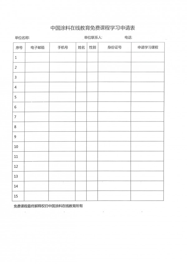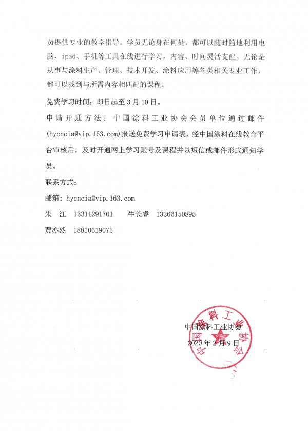申請開通方法:中國涂料工業協會會員單位通過郵件(hycncia@vip.163.com)報送免費學習申請表,經中國涂料在線教育平臺審核后,及時開通網上學習賬號及課程并以短信或郵件形式通知學員。