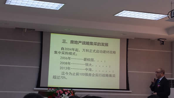 中國涂料工業協會建筑涂料分會理事長徐理德先生致歡迎辭,并就房地產與涂料戰略合作集采發展趨勢進行了分析,徐理德理事長指出,2013年中國市場上超過100億元的企業有2家(分別是立邦和阿克蘇諾貝爾),超過20億元的有11家(包括上海涂料,嘉寶莉,PPG,威士伯,湘江等),其中建筑涂料年銷售額超過10億元以上的有4家。在目前宏觀政策處于震蕩時期,各房地產企業通過對管控模式、產品結構、區域布局、融資渠道等方面多管齊下,全面提升核心競爭力。其中建材產品采購的質量和價格成為各個房企關注焦點之一,而戰略集中采購模式逐漸成為一種趨勢。迄今為止前100強房企實行戰略集采的超過70%,并呼吁房地產企業為了減少流程、節省支出等,應盡量采取集采的方式,達成共贏。