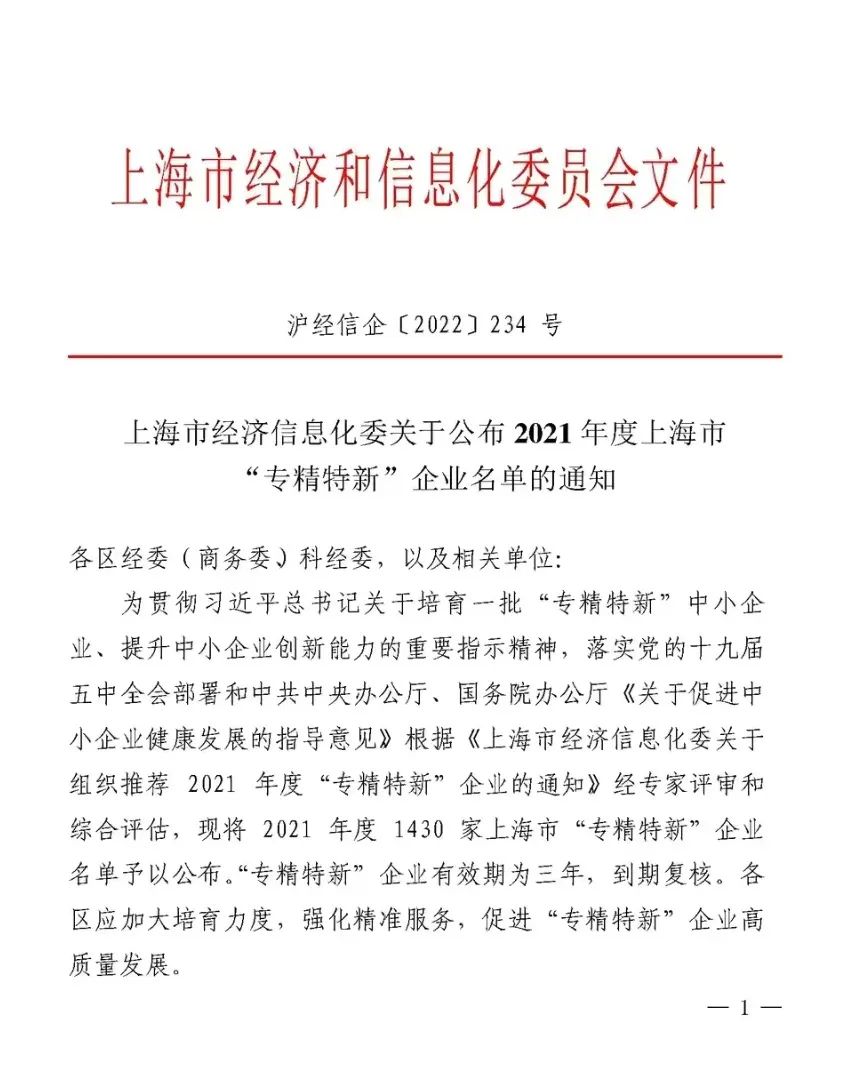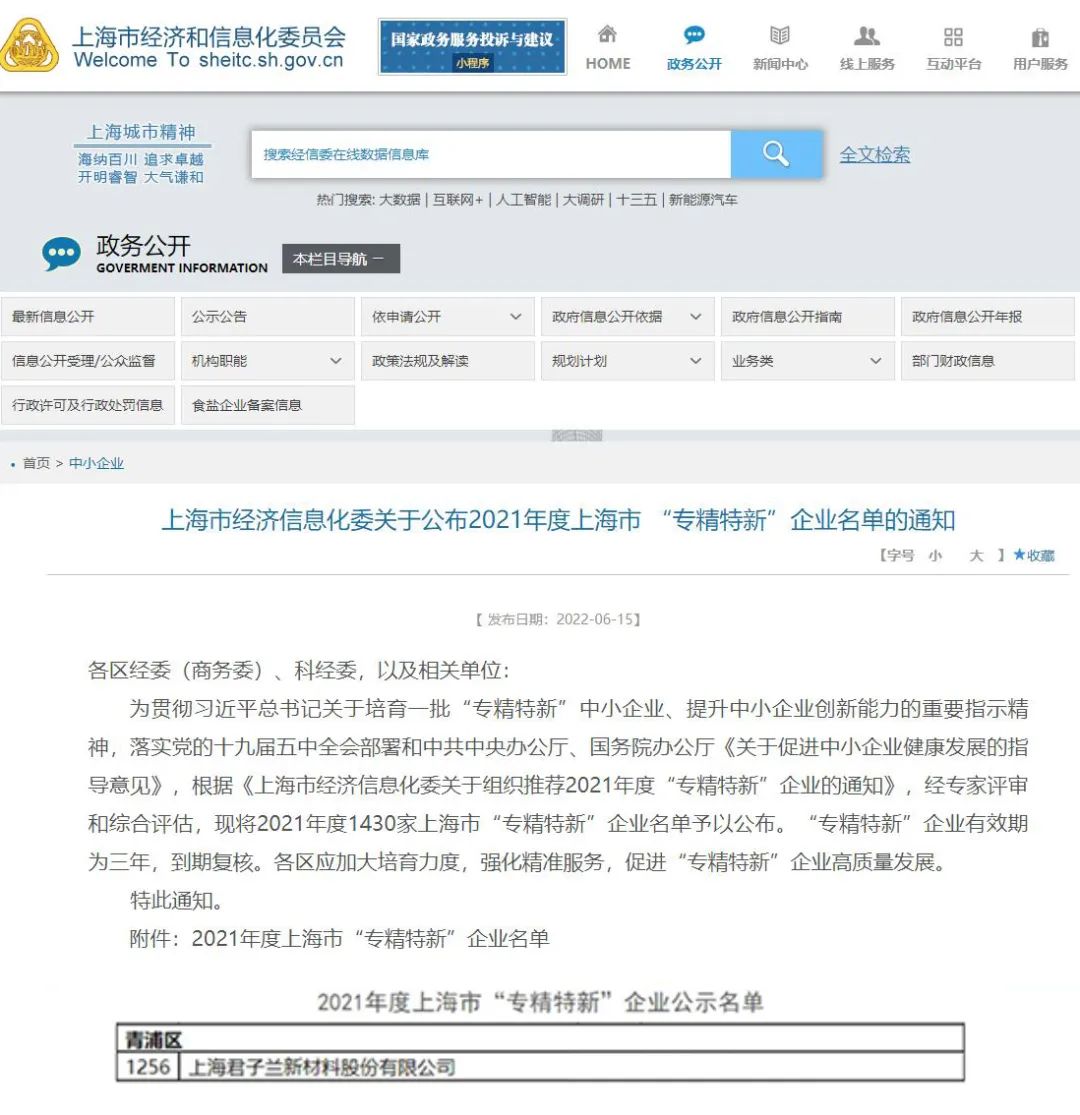 近日,上海市經濟和信息化委員會公布了2021年度上海市“專精特新”企業名單,上海君子蘭新材料股份有限公司榮登“專精特新”企業榜單!