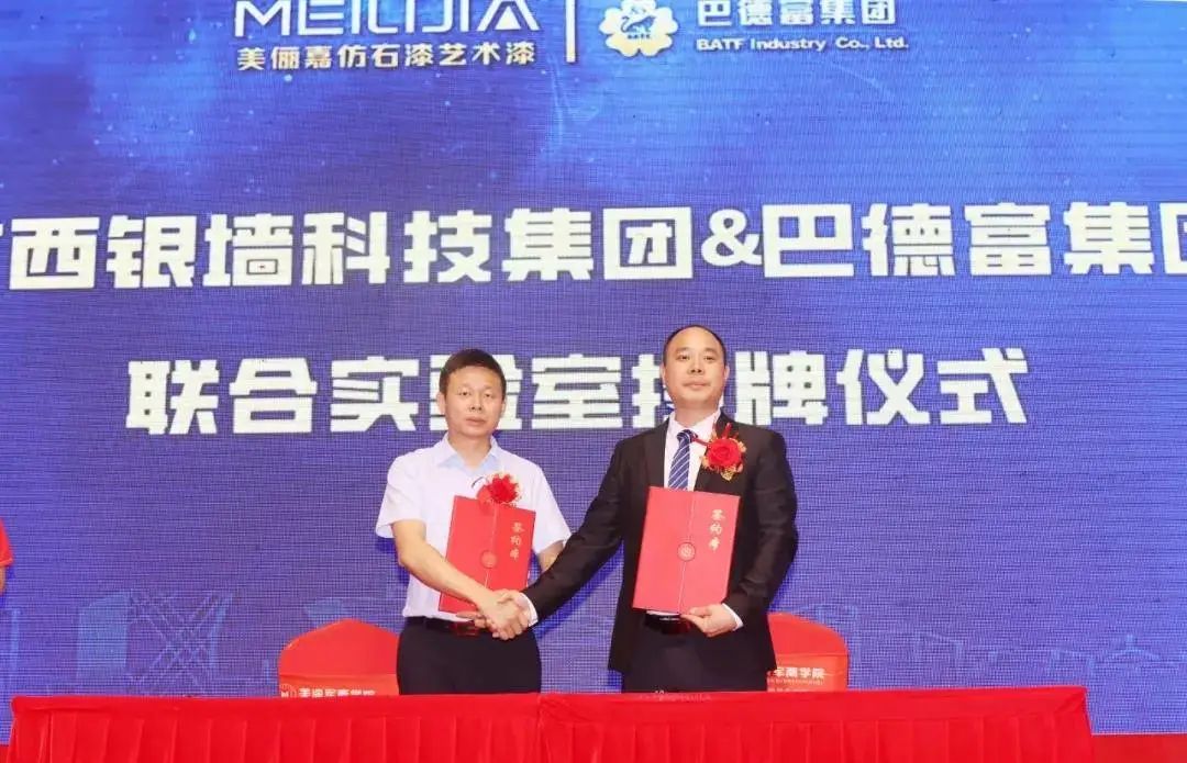 8月10日,巴德富&廣西銀墻戰略合作簽約儀式在廣西桂林舉辦,雙方攜手共同啟動打造聯合實驗室。廣西銀墻科技集團董事長美儷嘉品牌創始人唐文海、CEO美儷嘉品牌創始人王興、巴德富建涂事業部副總經理麥世華、建涂事業部華南大區銷售副總監崔俊等領導出席簽約儀式并為聯合實驗室揭牌。