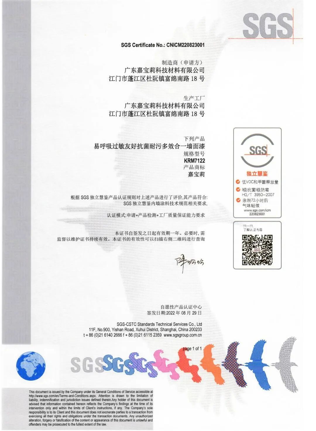 喜訊|嘉寶莉獲得中國涂料行業首張SGS獨立慧鑒認證書
