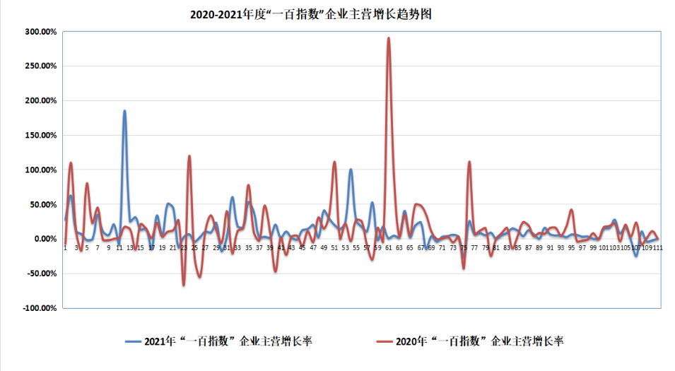 他還指出,從2020-2021年度“一百指數(shù)”企業(yè)主營增長趨勢(shì)來看,一百指數(shù)企業(yè)主營業(yè)務(wù)收入總和,相較于2020只有5.4%的增長來說,2021年取得了較為可喜的進(jìn)步,同比前一年增長17.5%。