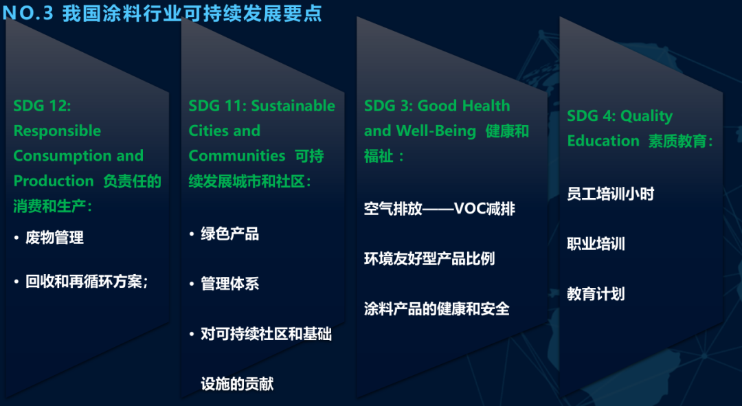 為此,中國涂料行業(yè)也要跟上全球涂料行業(yè)的發(fā)展步伐,要聚焦“負(fù)責(zé)任的消費(fèi)和生產(chǎn)”、“可持續(xù)發(fā)展城市和社區(qū)”、“健康和福祉”、“素質(zhì)教育”這四大關(guān)鍵點(diǎn)進(jìn)行發(fā)展。