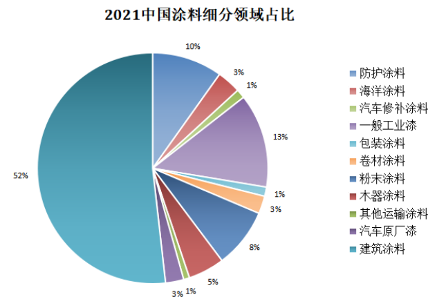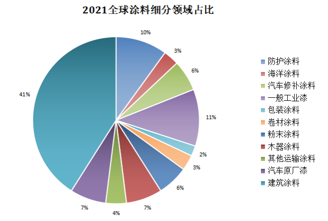 劉杰指出,從2021年中國與全球涂料行業(yè)細(xì)分對(duì)比來看,中國涂料行業(yè)細(xì)分領(lǐng)域占比與全球涂料細(xì)分領(lǐng)域占比并無太大差異,建筑涂料占比最大,其次是防護(hù)涂料。