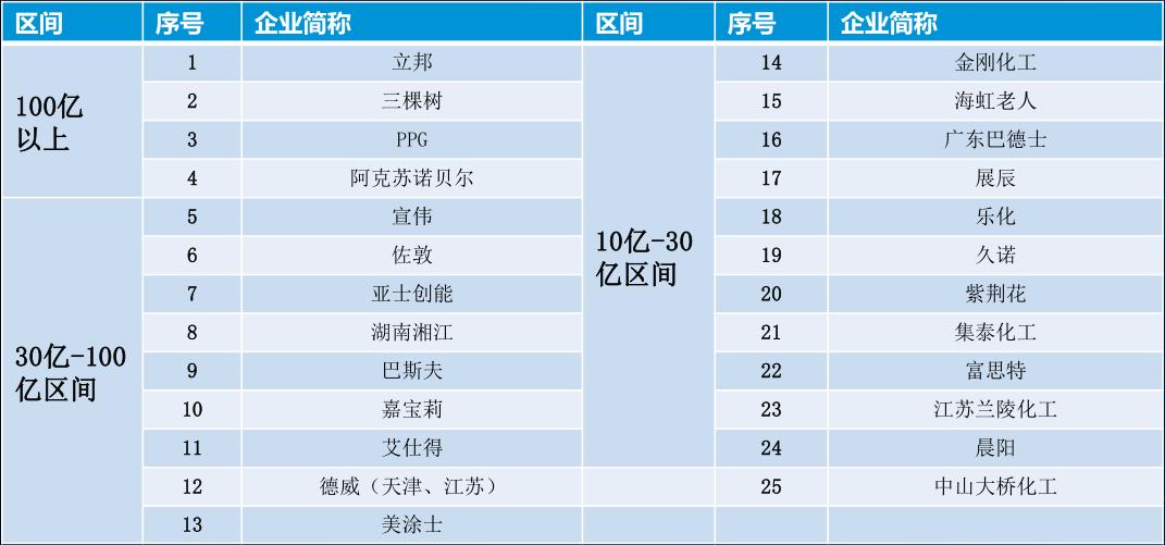他還對(duì)行業(yè)“一百指數(shù)”企業(yè)進(jìn)行了概括分析。他表示,可喜的是,中國100億元以上的涂料企業(yè)已經(jīng)有四家,30~100億元的企業(yè)有9家,10~30億元的企業(yè)有12家,種種跡象表明,中國涂料已經(jīng)在由大而強(qiáng)的路上邁出了可喜的一步。