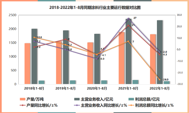 2022年1-8月,我國涂料行業(yè)全行業(yè)總產(chǎn)量約2259.7萬噸(含規(guī)模以下部分),較去年同期同比降低4.3%;主營業(yè)務(wù)收入總額約2897.6億元,較去年同期同比降低2.0%;利潤總額約141.1億元,較去年同期同比降低26.0%。