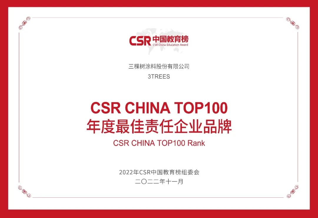 三棵樹涂料股份有限公司榮膺“CSR CHINA TOP100 年度最佳責任企業品牌”稱號
