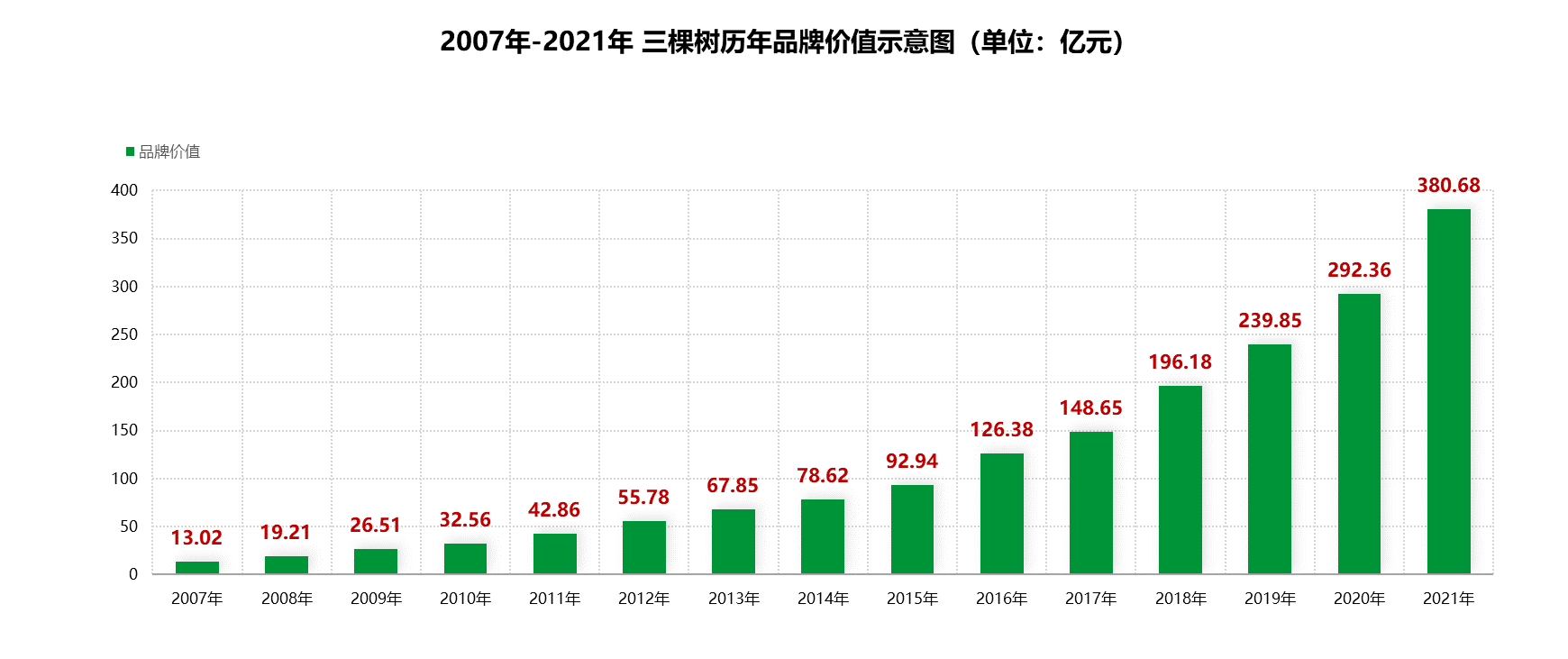 2007-2021年三棵樹歷年品牌價值示意圖  單位:億元