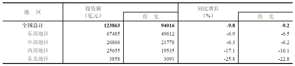 1—11月份,全國房地產開發投資123863億元,同比下降9.8%;其中,住宅投資94016億元,下降9.2%。