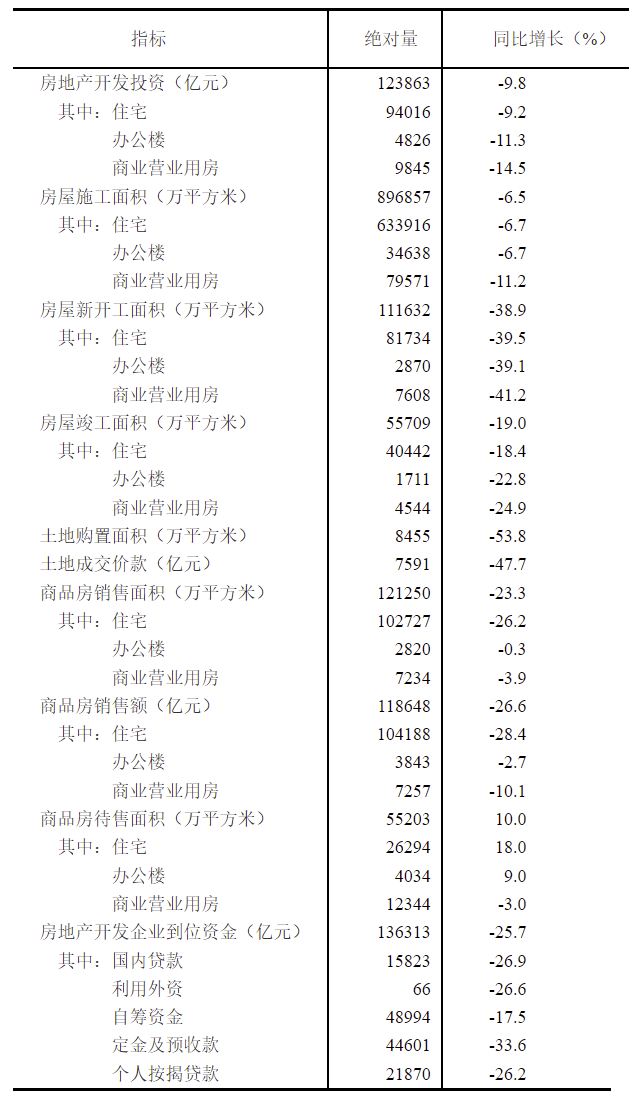1—11月份,房地產開發企業房屋施工面積896857萬平方米,同比下降6.5%。其中,住宅施工面積633916萬平方米,下降6.7%。房屋新開工面積111632萬平方米,下降38.9%。其中,住宅新開工面積81734萬平方米,下降39.5%。房屋竣工面積55709萬平方米,下降19.0%。其中,住宅竣工面積40442萬平方米,下降18.4%。