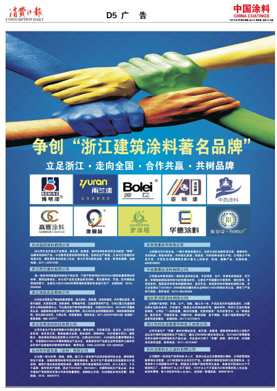 《中國涂料報》(電子版)的一切內容(包括但不限于文字、圖片、PDF、圖表、標志、標識、商標、版面設計、專欄目錄與名稱、內容分類標準以及為讀者提供的任何信息)僅供中國涂料信息網讀者閱讀、學習研究使用,未經中國涂料雜志社有限公司及/或相關權利人書面授權,任何單位及個人不得將《中國涂料報》(電子版)所登載、發(fā)布的內容用于商業(yè)性目的,包括但不限于轉載、復制、發(fā)行、制作光盤、數據庫、觸摸展示等行為方式,或將之在非本站所屬的服務器上作鏡像。否則,中國涂料雜志社有限公司將采取包括但不限于網上公示、向有關部門舉報、訴訟等一切合法手段,追究侵權者的法律責任。